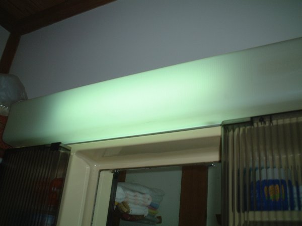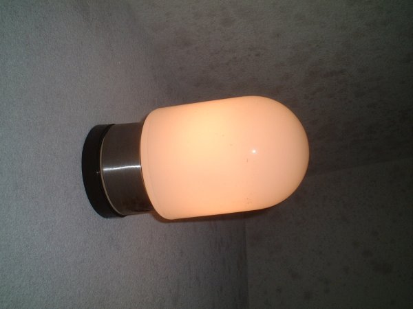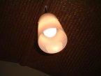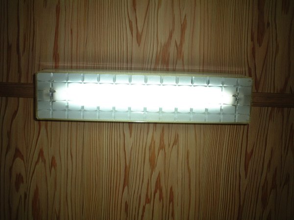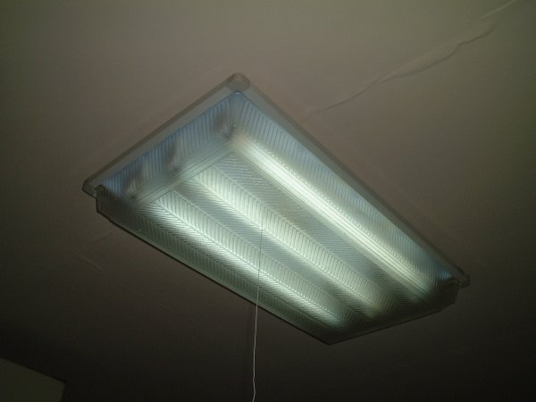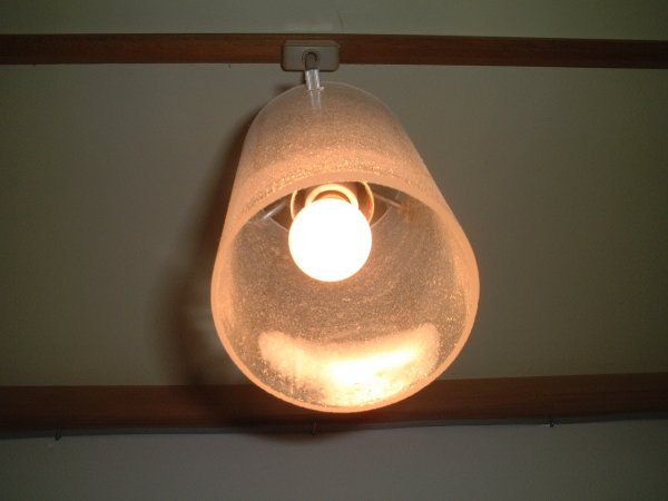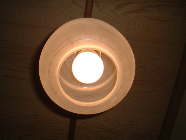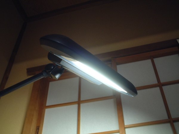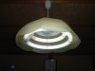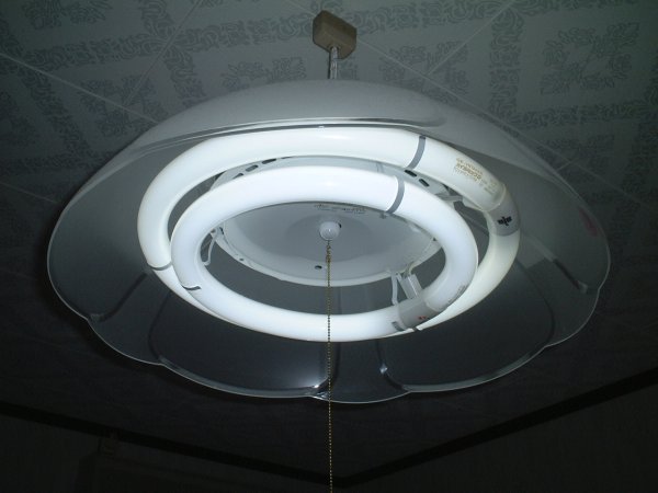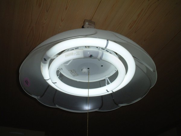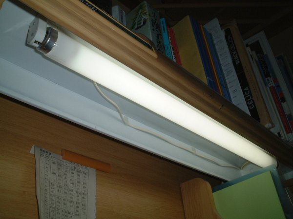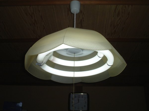 放電管の一種です. 天井で使われるタイプには,細長い棒状のものや環状のものが多く, 四角いものはあまりありません. 卓上用でも棒状のものが一般的でしたが, 最近では蛍光管をグニャグニャと折り曲げたものもよく見られます. でも,蛍光管を手で折り曲げると折れます. 長時間・長期間にわたり灯りが必要な場所では, 消費電力の低い蛍光灯が使われます. 家庭用蛍光灯(2001/06/19 福江 純 撮影) |