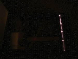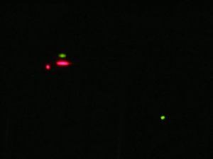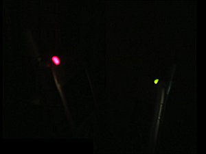 左の写真は,対物グレーティングを用いて撮影した トンネル内のナトリウムランプで(左:遠景,右:入り口), いずれも左から-2次,-1次,0次のスペクトルが写っています. トンネル内のナトリウムランプ (岡山県後月郡芳井町“芳井トンネル”にて 乗本祐慈 撮影) |