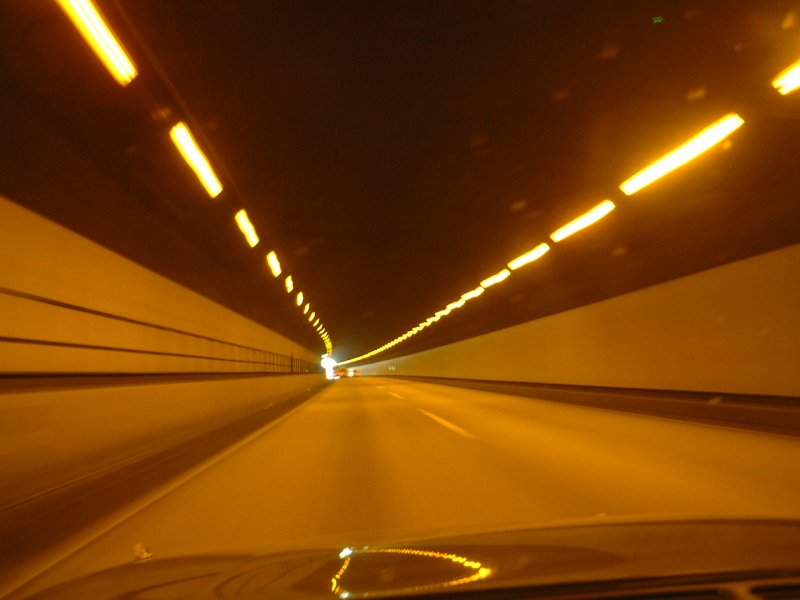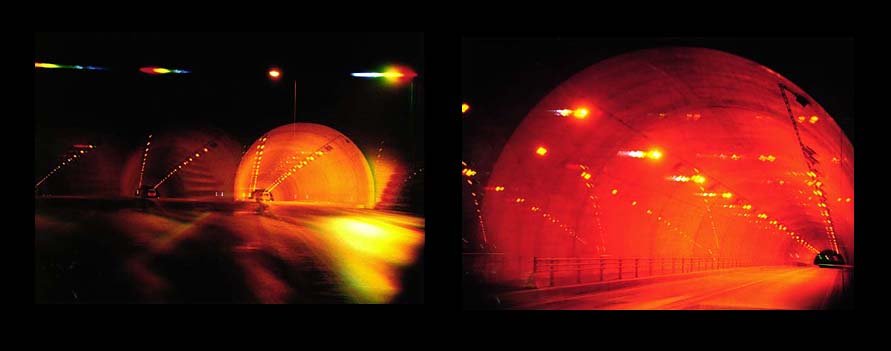 ナトリウムランプは霧の中などでも視認性が高いために, 高速道路やトンネル内などで利用されています. トンネル内のナトリウムランプ(2001/05/20 福江 純 撮影) |