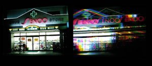 店内の蛍光灯と看板のネオンサインとではスペクトルが異なります.