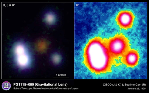 4個に分かれたクェーサー像がきれいに分離できています. 資料提供:国立天文台 ハワイ観測所,米原厚憲(筑波大学) |