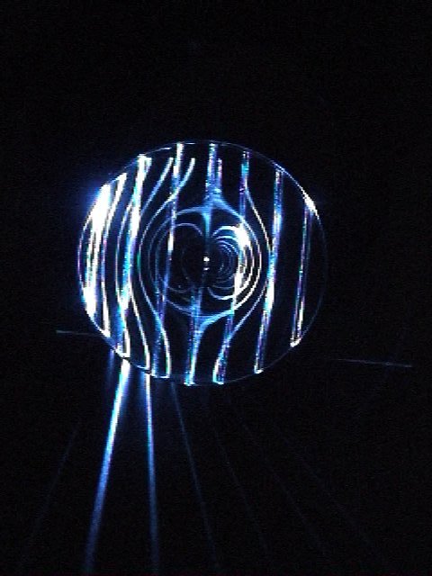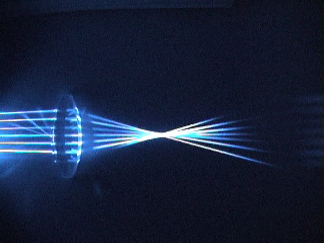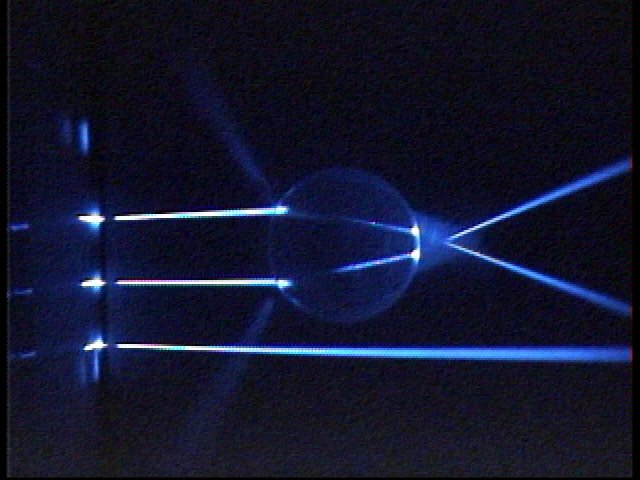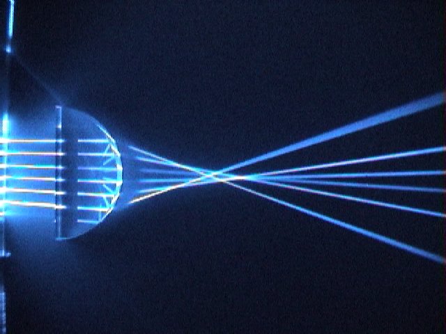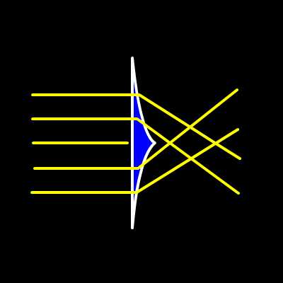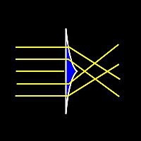 重力レンズとは,天体の重力場によって光が曲げられて, 遠方の天体の像が見える現象です. ワイングラスの足の部分のように, 中央がそりあがった形になったレンズが, 重力レンズと等価な光学レンズ (optical lens equivalent with gravitational lens) です. 等価重力レンズは,重力場中における光線の曲がりのように, 入射してきた平行光線を曲げることができます. その結果,実際の重力レンズ現象のように, 二重像やリング像などを生ずることができます.