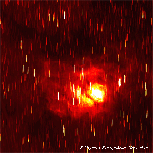 縦の線は,それぞれの星のスペクトルです. スペクトルの上下の幅はHα線を中心として90nmあり, 上が長波長側,下が短波長側を示しています. 星は,連続的なスペクトルを放出するので, このような画像では縦線に見えていますが, 星雲は上下に伸びずにそのままの形で明るく輝いています. これは,星雲のスペクトルは連続スペクトルではなく, 輝線スペクトルを出しているためで, ある特定の波長の光だけが輝いて見えているからです. 資料提供:小倉勝男(國學院大学),坂元 誠(西はりま天文台), 有本淳一(京都市立塔南高等学校) |
