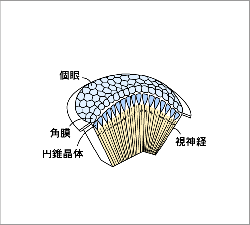 複眼は小さな個眼が集まったもので,個々の個眼は, ひとつの物体のそれぞれ違う領域を映し出しています. 個眼は,少ないものでも30個, たいていは数千個が集まってひとつの複眼をつくっており, 昆虫は,それぞれ違う部分を映し出した個眼の情報を併せて, 見ているもの全体の姿を認識しているのだと想像されています. |