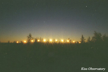 左:1986年8月4日,北緯79度のスピッツベルゲン島ニューオルソンで撮影された真夜中の太陽.19時15分〜翌日の4時15分までの9時間の動きを15分間隔で撮影.