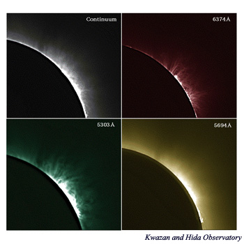 左下:緑の画像.波長530.3nm(5303オングストローム)で見たコロナ. 鉄の13階電離イオンが出す輝線で, そのあたりの温度が約200万度であることを示しています. この光は緑色の波長域にあるので,グリーンライン(green line)とも呼ばれています. 右上:赤の画像.波長637.4nm(6374オングストローム)で見たコロナ. 鉄の9階電離イオンが出す輝線で,温度約100万度に対応しています. レッドライン(red line)とも呼ばれています. 右下:黄色の画像.波長569.4nm(5694オングストローム)で見たコロナ. ずっと低い温度成分です. 資料提供:京都大学附属 花山・飛騨天文台 | |
