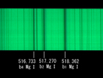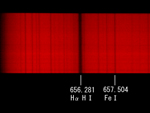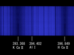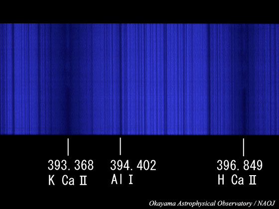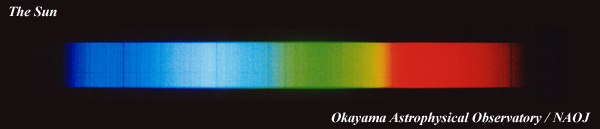 赤から紫まで連続的につながった虹色の太陽スペクトルの強度分布は, 絶対温度約6000度の黒体放射によく似ています. 連続スペクトル中にはフラウンホーファー線とも呼ばれる多数の暗線(吸収線)が見られます. | |||