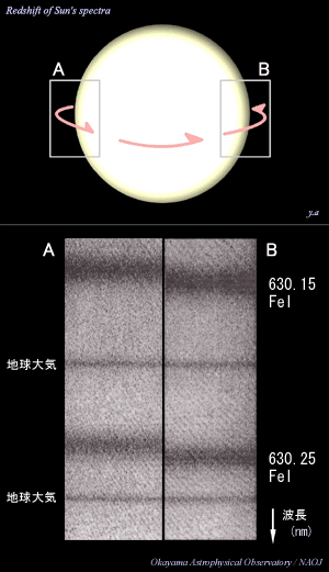 太陽の東と西の縁付近にスリットを当ててスペクトルを観測すると, 吸収線の位置がもとの波長よりも少しずれて見えます. これは太陽の自転に伴うドップラー効果によって, スペクトル線が偏移しているからです.
