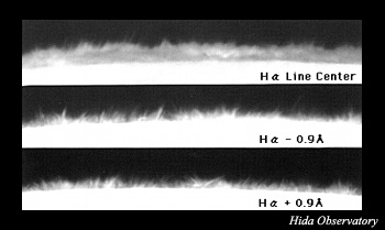 スピキュール(spicule)とは, 太陽の彩層から針のように突き出て見えるガス体です. 左:3つの波長で見た太陽の縁のスピキュール.1985年8月18日撮影. |