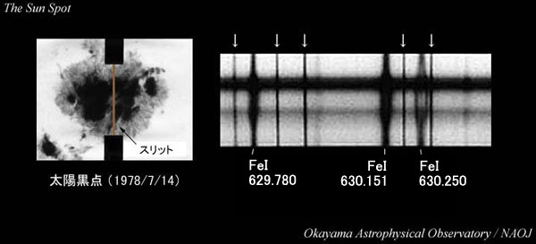 左は分光器のスリットのモニター像. 右は左のスリット部分から入射した光をスペクトルに分解. 黒点の吸収線(ここではFeI)は広くひろがり,分岐しています. 図上の↓は地球大気による吸収線です. 黒点のスペクトルを観測すると, 吸収線が広がっている上に3本あるいはそれ以上に分岐する様子が見られます. 吸収線が強いのは主に黒点の温度が光球より低いためですが, 線が分岐するのは黒点の強い磁場の影響によるもので, ゼーマン効果(Zeeman effect) と呼ばれる現象です. 太陽黒点のスペクトルにおけるゼーマン効果は, 1908年からウィルソン山天文台のヘール(G.E. Hale)によって系統的に観測され, その結果,黒点の磁場の極性は約11年毎に反転し, 約22年で元に戻ることが明らかになりました. 資料提供:国立天文台 岡山天体物理観測所 | |