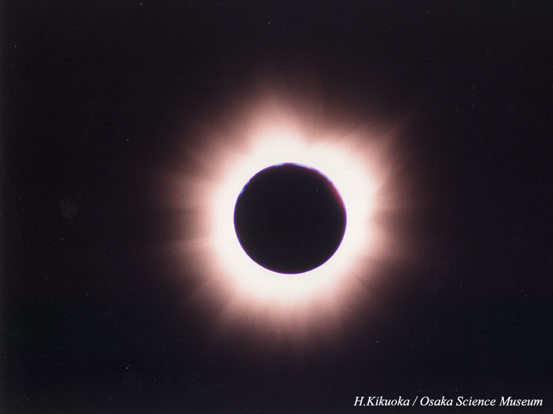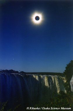 母なる太陽として,昔から人々は太陽を信仰の対象とし,畏敬の念を抱いてきました. 左:2001年6月21日のアフリカ皆既日食.撮影地はジンバブエ. 同国とザンビアとの国境付近にあるビクトリアの滝との合成写真. 実際には,ここでは日食は見えませんでした. 資料提供:菊岡秀多(大阪市立科学館) |