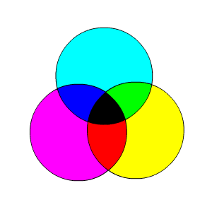 シアンとマゼンタを混ぜると青に,マゼンタとイエローで赤に, イエローとシアンで緑になり, 他のすべての色料も3原色を適当な割合で混ぜ合わせることで作れます. 色料の3原色を混ぜ合わせると明度が下がるので, それを減法混色と呼びます. シアンとマゼンタとイエローを等量混ぜると黒色になります. |