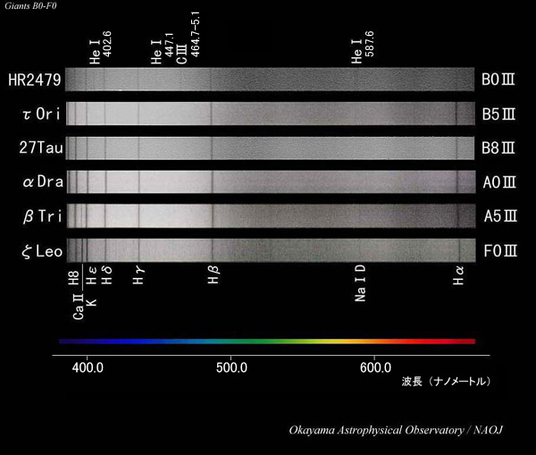 スペクトルの特徴は, B0型では中性ヘリウムHeIの線が強く見えています. しかしその後は見えなくなり,代わりに水素のバルマー線が強くなる様子がわかります.