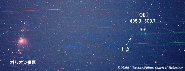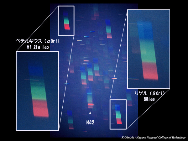 オリオン座の他の星を見ると, リゲルのスペクトルのように吸収線がほとんど見えていないことから, オリオン座は青い星=温度が高い星で形作られていることがわかります. またM42のスペクトルには,はっきりと輝線が見えています. 資料提供:大西浩次(長野工業高等専門学校) |