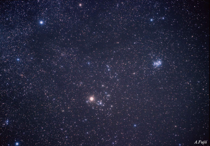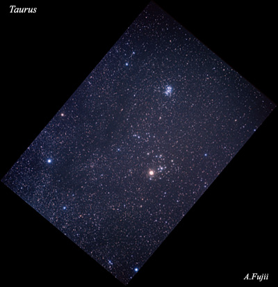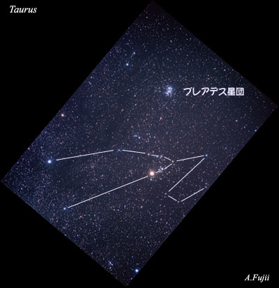 右上の青白い星の集まりが,プレアデス星団(すばる), 右下の横Vの字の星の並びがヒアデス星団です. プレアデス星団は408光年,ヒアデス星団は149光年の距離にあります. 赤い1等星アルデバランもVの字の並びに位置していますが, 実際にはヒアデス星団よりもずっと近く,65光年の距離にあり, ヒアデス星団には含まれません.