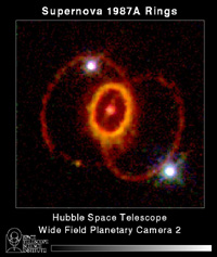 星の表面だけが吹き飛ぶ新星とは違って, 超新星は星全体が吹き飛んでしまう激しい現象で, 膨張速度は数1000km/sにも達します. 超新星は観測的には,分光学的な特性に基づいて分類されています. 水素のスペクトル線の見えないI型超新星(type I) と, 水素スペクトル線の見えるII型超新星(type II) に大きく分けられます. I型はどの銀河にも発生し, II型は渦状銀河の腕や不規則銀河によく見られます. Ia型の爆発はよく似通っていて, 極大光度がどのIa型もほぼ同じだと考えられます. その結果,遠くのIa型超新星を観測することにより距離が求められ, 宇宙の大きさや進化についての大きな手がかりとなっています.