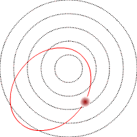 下の図は,いろいろな惑星系の軌道を表しています. 親星を中心として(親星は描いてありません), 色の付いた軌道を回転している赤い丸が惑星です. 大きな丸は観測された質量が大きなことを表しています. また黒の破線で描いた円は,1天文単位ごとの円で, たとえば5本あれば,一番外側が5天文単位ということになります. |